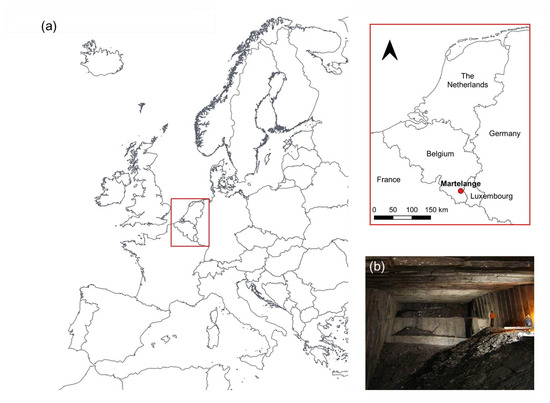 (a) Location of the Martelange mine in Belgium (map data obtained from EuroGeographics and UN-FAO) and (b) a typical chamber in the mine that could be used as a reservoir ((b) courtesy of V. Duseigne, http://tchorski.morkitu.org/2/martelange-02.htm).