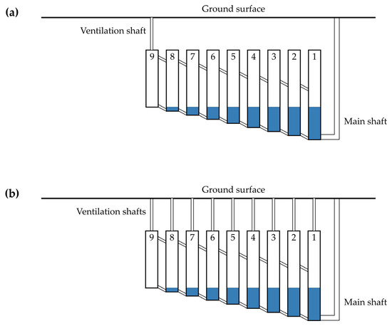 Sketch of the nine underground chambers used as underground reservoir of an underground pumped storage hydropower (UPSH) for (a) partially aerated and (b) fully aerated chambers. The ventilation shaft in (a) has a rectangular cross-section with 1.5 × 1.5 m2 while the ventilation shafts in (b) are considered large enough to secure atmospheric pressure in the chambers. The water level corresponds to the initial conditions of the simulations.