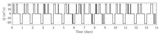 Discharge, Q, pattern for the winter period based on current electricity prices variation in Belgium. Positive and negative discharges correspond to turbining and pumping, respectively.