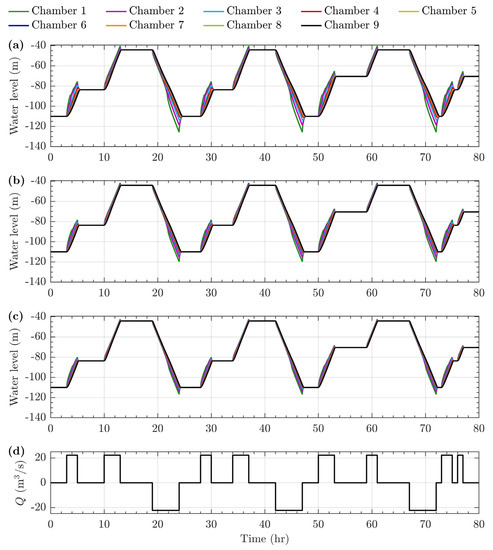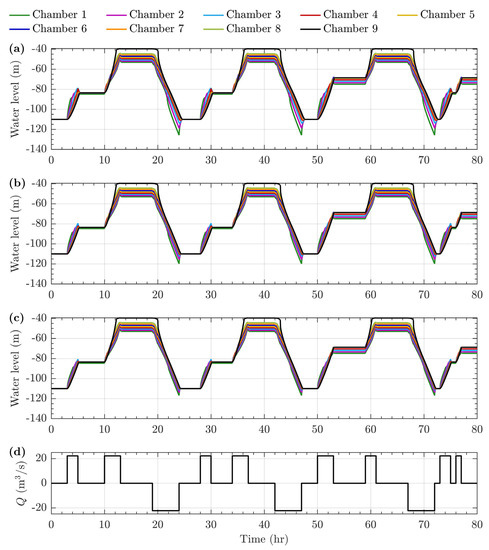 The 14-day discharge scenario (Figure 3) exhibited a relative periodicity after a certain duration. For easier interpretation of the variation of the water level across all nine chambers, only the first 80 h of the winter discharge pattern, Q, are presented in Figure 4 and Figure 5 for partially aerated and fully aerated underground chambers, respectively, for the three smaller cross sectional areas of the connecting galleries (Table 2).