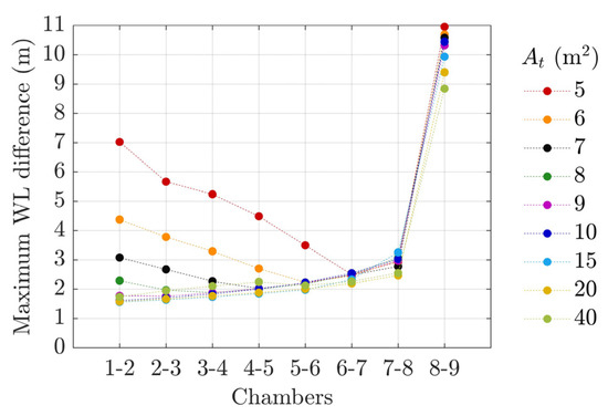 Figure 6 and Figure 7 show the maximum water level differences between successive chambers across the whole 14-day period for partially and fully aerated chambers, respectively, for the winter discharge scenario. Both in the partially and fully aerated cases, the maximum water level difference dropped rapidly with increasing cumulative cross section of the connecting galleries. For fully aerated chambers, the maximum water level differences between the first two chambers with the smallest connecting galleries were a little higher during the water pumping phase compared to the turbining phase (Figure 7). However, the water level differences after the second chamber were slightly higher in the turbining phase, most evidently for the smaller cross-sections. The maximum water level differences in fully aerated chambers were always greater for chambers that were closer to the main shaft, which was connected to chamber 1; however, for total cross sectional areas of the connecting galleries greater than 15 m2, the differences became rather negligible. Notably, the maximum water level difference between the first and last chamber in the fully aerated case could be expressed as a power function of the total cross-sectional area of the connecting galleries, both for the turbining and the pumping phase (Figure 8).