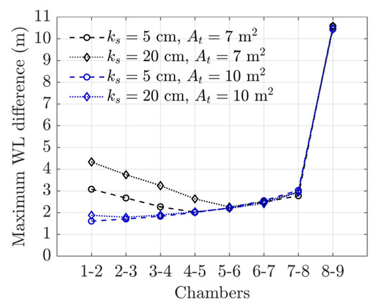 The effect of the hydraulic roughness of the connecting galleries on the water level differences between successive chambers was additionally analyzed. So far, a 5 cm value of the roughness height, ks, of the connecting galleries was considered. An increase of ks to 20 cm has been examined. The effect of increased roughness in the connecting galleries on maximum water level differences was more prominent for the chambers closer to the main shaft, both for partially aerated (Figure 9) and fully aerated (Figure 10) chambers. The induced differences for a 7 m2 total cross-sectional area of the connecting galleries exceeded one meter for the first two chambers and became negligible at the chambers away from the main shaft. When the total cross sectional area of the connecting galleries increased from 7 to 10 m2, the effect of the increasing roughness in the connecting galleries became much less prominent, especially when the chambers were only partially aerated (Figure 9).