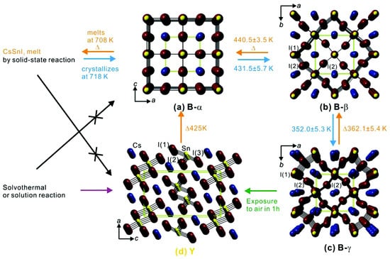 Illustration of phase change details of four CsSnI polymorphs and their crystal structures. How phase transitions of CsSnI polymorphs proceed is displayed with synthesis conditions and conversion temperatures obtained by in situ, temperature-dependent synchrotron powder XRD studies. Crystal structures of the respective polymorphs are shown: (a) black cubic (B-) at 500 K; (b) tetragonal (B-) at 380 K; (c) orthorhombic (B-) at 300 K; (d) yellow (Y) phase at 300 K. Disordered atoms in (c) are omitted for clarity. Cs atoms, blue; Sn atoms, yellow; I atoms, violet. Green dashed lines represent a unit cell. (Reproduced with permission from [60]. Copyright (2012) American Chemical Society.)