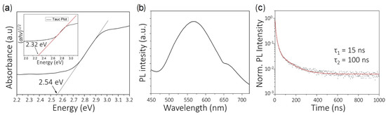 Experimental synthesis and characterization of CsBiAgCl. (a) UV–Vis optical absorption spectrum of CsBiAgCl. The inset shows the Tauc plot, corresponding to an indirect allowed transition (assuming the expression: (h)1/2 = C(h – E), where is the absorption coefficient, h is the energy of the incoming photon, E is the optical band gap, and C is a constant). The straight lines are fitted to the linear regions of the absorption spectrum and Tauc plot, and the intercepts at 2.32 eV and 2.54 eV marked on the plot are calculated from the fit. (b) Steady-state photoluminescence (PL) spectrum of CsBiAgCl, deposited on glass. (c) Time-resolved photoluminescence decay of CsBiAgCl, deposited on glass. The data were fitted using a biexponential decay function. The decay lifetimes of 15 (fast) and 100 ns (slow) were estimated from the fit. (Adapted with permission from [132]. Copyright (2016) American Chemical Society.)