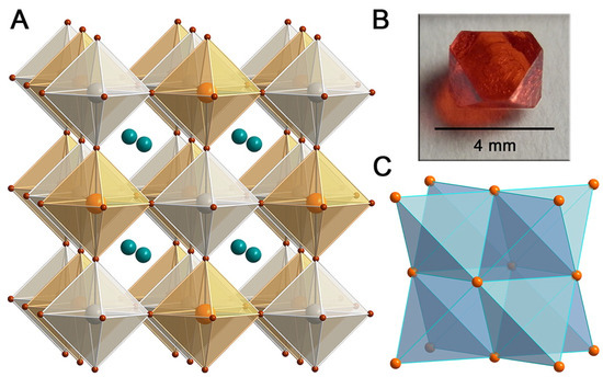 (A) X-ray structure of the ordered double perovskite CsAgBiBr (1). Orange, gray, turquoise, and brown spheres represent Bi, Ag, Cs, and Br atoms, respectively. (B) Photograph of a single crystal of 1. (C) The Bi face-centered-cubic sublattice in 1, consisting of edge-sharing tetrahedra. (Reprinted with permission from [138]. Copyright (2016) American Chemical Society).