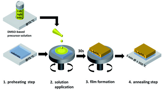 Still focusing on CABB, by means of a time-resolved microwave conductance (TRMC), Bartesaghi et al. [154] have characterized the carriers’ behavior. In detail, the shallow trap states induced by both carriers in CABB bandgap are responsible for the temperature and intensity-dependence of the lifetime of mobile charges in the bulk. The detrimental large amount of such trap states is, on the other hand, compensated by their shallow nature, and additionally, the recombination induced by such trap-states seems to take place over quite long time, revealing the potential good performances of CABB in PV. The first attempt to incorporate CsAgBiBr films on PV devices was due to the work of Greul et al. [149]: here the precursors (CsBr, AgBr and BiBr) that were dissolved in DMSO and the substrate (mesoporous (mp)-TiO) were preheated (process associated with a beneficial increase of the final device short-circuit current (J), fill factor (FF), and V) at 75 C before spin-coating the precursors on the substrate. This process was followed by a further annealing (up to 285 C) to improve the final quality of the device (see Figure 7 for the whole procedure). The hole transport layer is the commonly used 2,2,7,7-tetrakis-(N,N-di-4-methoxyphenylamino)-9,9-spirobifluorene (spiro-OMeTAD).