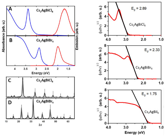 (Left) (A,B) Absorption (blue) and emission (red) spectra of 8 nm CsAgBiCl (A) and CsAgBiBr (B) nanocrystals. Absorption spectra were collected from hexane solutions at room temperature and emission spectra were collected on thin films at 20 K using 405 nm (for CsAgBiBr) or 365 nm (for CsAgBiCl) excitation. (Right): Tauc analysis of indirect bandgaps in CsAgBiX. (X = Cl, Br, I). (Adapted with permission from [144]. Copyright (2018) American Chemical Society).