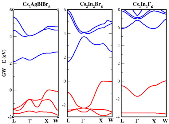 Still on the NC realm, Bekenstein, et al. [159] studied the optical properties of CsAgBiX (X = Cl, Br). The authors synthesized 8–15 nm NCs by means of two different paths. The first is a modified version of that used by Protesescu et al. [160] for CsPbX NC synthesis and consists of an injection of Cs-oleate in a solution of precursors (AgBr and BiBr) in octadecene with oleylamine and oleic acid at a high temperature. The second follows that of Xu et al. [161] and consists of a lower temperature injection of halide precursor into a solution of metal acetates. NCs obtained show a similar XRD pattern of the corresponding 3D phases. Concerning the optical features of the two halides, a sharp peak (1 eV higher in energy than the band edge, ascribed to a Bi 6s–6p transition) at 430 nm (X = Br) and 365 nm X = Cl) arises in absorption spectra of such NCs. More exotic seems to be the CsNaBiX class of compounds: while only the X = Cl [162,163] was initially investigated, more recently the X = Br and X = I compounds have been at first theoretically predicted [164]. and then in a couple of very recent papers [165,166], high quality CsNaBiI films have been synthesized and applied as solar harvesters. The oost treatment procedure (isopropyl alcohol soaking and DMF annealing) has led to a ten-fold improvement of the solar device PCE (0.021% to 0.21%) with no loss even after 100 days in ambient conditions. Among all the quaternary double-perovskites, probably the most investigated and with enhanced applicability in optoelectronics is represented by the indirect bandgap CsAgBiBr perovskite. In our research [54], we have tried to focus on the debated, yet undisclosed origin of the Stokes shift in PL, whose peak is reported fairly below 2.0 eV, and the UV–Vis spectra which has a peak above 2.0 eV [138,167,168]. In order to do it, we have compared the structural, electronic, and optical features of CABB with that of other two double-perovskites but with ternary stoichiometry; i.e., CsInX (or CsIn(I)In(III)X) with X=F, Br [169]. Our quasiparticle (QP) electronic band structures obtained within the GW perturbative approach confirmed the indirect nature of the bandgap of CABB and other compounds (see Figure 9). Additionally the values obtained are in line with previously calculated ones, but a larger opening of the gap was observed due to the self-consistent cycles (eigenvalues only evGW) in the GW calculations.