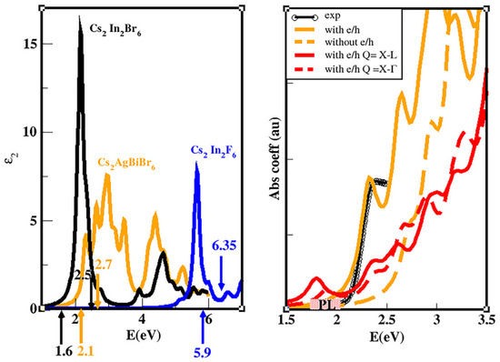 (Left) Imaginary part of the dielectric function for the three double perovskites, obtained taking into account the QP corrections calculated at the GW level of approximation and also including the excitonic and local-field effects through the solution of the BSE. The up-oriented (down) arrows (and relative numbers) indicate the energetic positions of the indirect (direct) minimum QP gap. (Right) Theoretical absorption coefficient with (orange solid curve) and without (orange dashed curve) the local field and excitonic effects, compared with the experimental curve (black curve) from [138]. The red (dashed and solid) curves are the EELS spectra calculated with e–h effects included for finite transferred momentum Q corresponding to the lowest indirect transition L–X and –X, respectively. The energetic region where the PL is observed is indicated schematically by the shaded yellow area. (Reprinted with permission from [54]. Copyright (2020) American Chemical Society).
