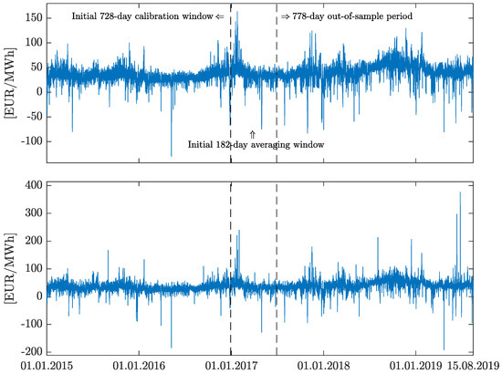 Following the majority of forecasting literature, we consider a so-called rolling window scheme. Similarly to [18,19], instead of arbitrarily choosing a fixed calibration window length, we consider a set of 673 different window lengths—ranging from 56 (ca. two months) to 728 days (ca. two years)—obtained forecasts are later averaged (see Section 4). The first 728 (=) days are used for the initial model calibration. For each day in the period 29 December 2016 to 15 August 2019, we compute 24 point forecasts, one for each hour of the day. In addition, we use a 182-day fixed-length sample for the calibration of the averaging methods (see Section 4) to obtain the average forecast for each hour of the days between 29 June 2017 and 15 August 2019. The forecasts for all 778 days of the out-of-sample period are evaluated in Section 5. The end of the initial 728-day model calibration window (i.e., 1 January 2015 to 28 December 2016), as well as the end of the initial 182-day calibration window for averaging forecasts (i.e., 29 December 2016 to 29 June 2017) are indicated by dashed, vertical lines in Figure 1 and Figure 2.