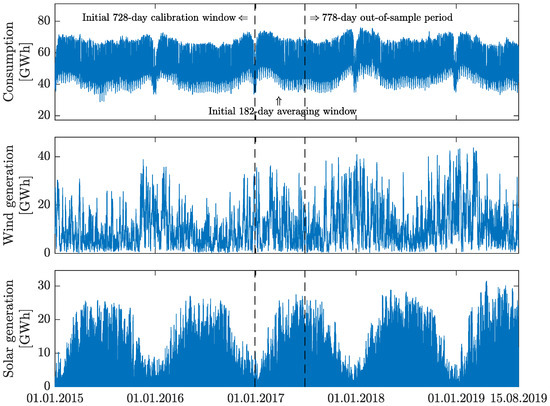 In order to test the proposed methodology, we utilize a number of datasets from the German market—each of them spans from 1 January 2015 to 15 August 2019. We consider two different price time series: the day-ahead hourly electricity prices (top panel in Figure 1) and the corresponding time series linked to the intraday market—the ID3 index hourly prices (bottom panel in Figure 1). According to the official rules by EPEX SPOT [37], the ID3 index is calculated as the volume-weighted average price of all trades within 3 h before the delivery of the product (up to 30 min before delivery). Apart from the price series, we use data for different types of exogenous variables: the day-ahead consumption prognosis (top panel in Figure 2) as well as the day-ahead wind and solar generation forecasts (respectively: middle and bottom panels in Figure 2). The wind generation forecast consists of aggregated forecasts of offshore and onshore generation forecasts.