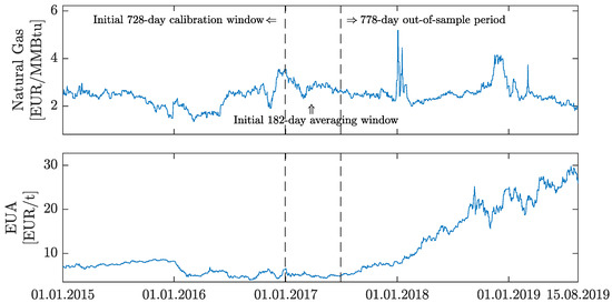 Daily natural gas spot prices (top) and carbon emission allowances (EUA) spot prices (bottom). Data span from 1 January 2015 to 15 August 2019. Note that for each series plot, the limits on the y axes are differ. The first vertical dashed line marks the end of the 728-day calibration period and the second marks the end of the initial 182-day calibration window for averaging forecasts.