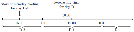 Market trading timeline; the forecasting of and for day D is performed at 10:00 of day .