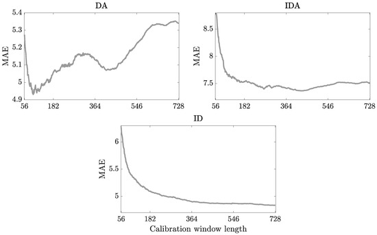As mentioned earlier, in this paper we consider training samples of lengths ranging from 56 to 728 days. Since the same model calibrated to a sample of different lengths produces differing forecasts, this gives us 673 different ‘sub-models’ for each of the models. The forecasting performance is evaluated separately for each calibration window, and the results are shown in Figure 5—each dot represents the MAE of forecasts obtained by calibrating the model to a sample of a certain length. Interestingly, the curves for and models are not monotonic as one may expect, the forecasting error does not strictly fall with the increase of the calibration sample length. This behavior of MAE may suggest that the models are slightly misspecified due to, for example, assumed linearity, time-invariant parameters or omitted variables. In such a case, the parameter estimates are inconsistent and do not converge to their true values. On the other hand, the curve for the model is descending. The forecasting accuracy of this model increases with the length of the calibration window, leaving little room for an improvement for averaging techniques.