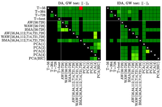 Finally, the results are evaluated with the Giacomini-White test [52] for the norm of order one. The outcomes are presented in Figure 6, on which a non-black square indicates that the forecasts of a model on the X-axis are statistically more accurate than the forecasts of a model on the Y-axis. The results confirm previous findings and show that PCA schemes outperform other methods, when the day-ahead forecasts are considered. This outcome is supported by two observations: