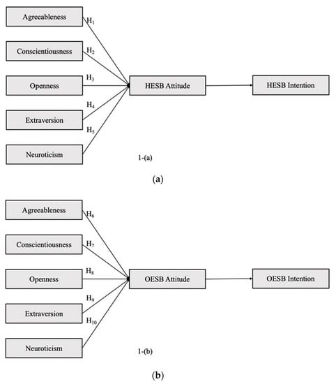 The hypotheses and relationships between variables in the research framework are presented graphically in Figure 1. Figure 1a shows the research model for HESB, while Figure 1b shows the research model for OESB.