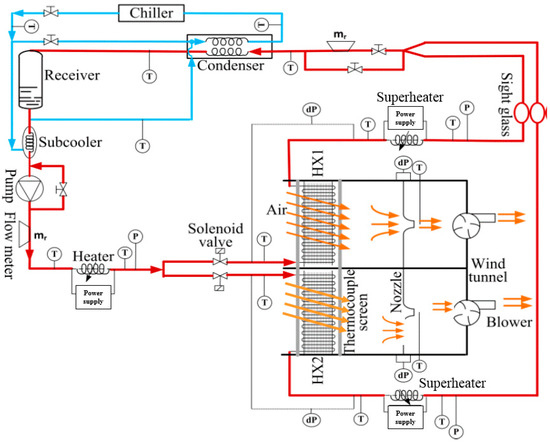 The chilled loop is used to cool the refrigerant vapor in the condenser and subcooler. The chilled fluid is the mixture of water and ethylene glycol with a volume ratio of 1:1. The temperature of chilled fluid is measured before and after the condenser. The air loop provides air flow to exchange heat with two-phase R134a in the heat exchangers. The air flow rate is measured by a nozzle system. The measurement method and design of the nozzle refer to the American Society of Mechanical Engineers (ASME) Standard MFC-3M [27] and ASME Standard PTC 19.5 [28]. The air flow is circulated by a blower controlled by a speed controller. The temperature of the air flow is measured before and after the heat exchangers.