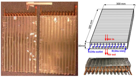 Figure 1 shows a schematic of the two-phase pulsating flow boiling experimental system [25,26]. There are three loops in the system: refrigerant loop (red line), air loop (orange line), and chilled loop (blue line). In the refrigerant loop, the subcooled refrigerant R134a is pumped by a gear pump from a subcooler. Then the fluid passes through a flow meter and is heated by a pre-heater to control the vapor quality before the evaporators. After that, the two-phase R134a enters the two same sub-loops, starting from the solenoid valves, then the heat exchangers (HX1 and HX2), where it exchanges heat with air flow in a wind tunnel. After the heat exchanger, R134a is heated into superheated vapor by the superheaters. Finally, the two sub-loops meet and the vapor passes the condenser and is cooled by a chilled system. The heat exchanger used in our experiment was the fin-tube heat exchanger with 385 mm × 300 mm × 30 mm (length × width × thickness). The inner diameter of copper tube was 6.2 mm. The plain aluminum fins had a fin density of 15 fpi and fin thickness of 0.3 mm. The heat exchanger is shown in Figure 2.