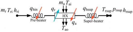 where hri and hrsup are the enthalpy of the refrigerant before the preheater and after the superheater. hr and ha are the refrigerant and air side HTC. ro and ri are the inner and outer diameter of the tube. Ao is the heat transfer ares of air side. η is the fin efficiency. Additionally, ha is calculated using correlation Kim–Youn–Webb’s correlation [29].