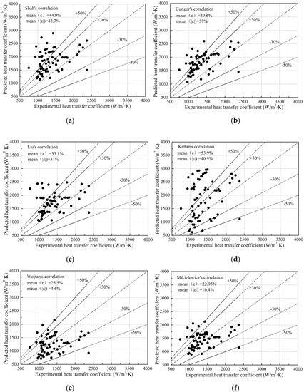 Comparison of the experimental HTC data and predicted results by empirical HTC correlations: (a) Shah, (b) Gungor, (c) Liu, (d) Kattan, (e) Wojtan, and (f) Mikielewicz.