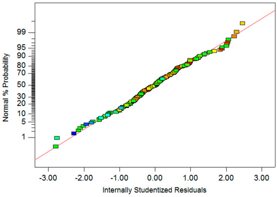 The normal probability plot for the residuals obtained from RSM for the regression model is displayed in Figure 5. It can be seen that all the residuals generally fell on or near the diagonal line, indicating that the errors satisfied normal distribution. In addition, almost all internally studentized residuals were close to zero, indicating that the regression model of the response had a better prediction precision.