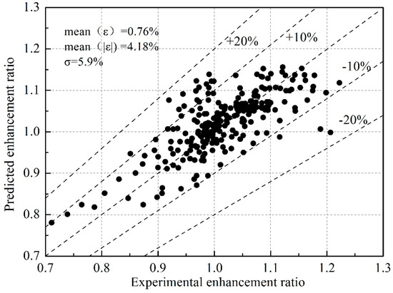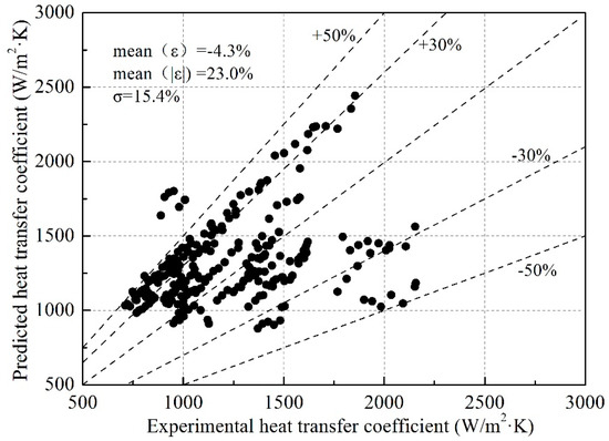 The comparison between the correlation predicted and experimental HTC in the two-phase pulsating flow is depicted in Figure 7. The results obtained with the new model shows a low mean error of −4.3% and a low standard deviation of 15.4%. Of the data 81.2% and 95.1% were contained inside the ±30% and ±50% error window, indicating that the correlation could predict the HTC in the two-phase pulsating flow well. It should be noted that a large dispersion between prediction and experimental values occurred at a high mass flow rate with a high inlet vapor quality. The error was mainly due to the overprediction of the annular zone in the two-phase continuous flow, as shown in Figure 4e.