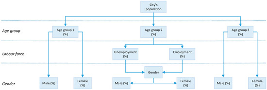 where Tag is the total share of the age groups’ share in the city. AG1 is the age group for people aged 0 to 17, and AG2 for people aged 18 to 64 and AG3 for people over the age of 64. In more detail, each age group has gender information, although we can also identify gender information at the higher level of the age groups, giving totals for each gender in the city. In this model, more details on the gender composition of each age group is required as expressed in Equation (2):