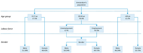 Therefore, the application of the Wepro model to the case-study city namely Amsterdam is as follows: First, the city’s population is represented by the sum of the composition of age groups in Amsterdam. We grouped the city’s age groups into three categories: 0–17 years old = 17.5%; 18–64 years old = 70.3%; and above 64 years old = 12.2% [57,58] using the formula in Equation (1):