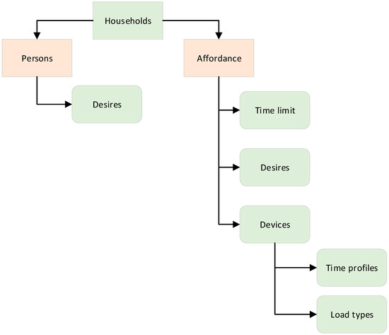The second profile generator used in our work is ALPG. ALPG employs household occupancy profiles generated by a simple behavioural model, which creates consistent profiles for the devices. The devices’ flexibility is specified through four classes: timeshiftables, buffer-timeshiftables, buffers and curtailable. The inflexible electricity profiles are grouped into the following categories: stand-by load, consumer electronics, lighting, inductive devices, fridges, and other. Furthermore, to show annual electricity consumption, the individual profiles are scaled in magnitude, making it easier to alter the profile if there is a change in electricity usage by the external factors. An example of such a change could be the adoption of a new technology, for instance, light-emitting diode (LED) lights. Moreover, the following classes in Figure 5 are implemented in the simulation model: neighbourhood, household, person, device, house, writer and ALPG. Electricity usage in a typical Dutch setting is the focus of ALPG, which is also in line with our work in modelling residential electricity load profiles, with Amsterdam as the case-study city [16,17].
