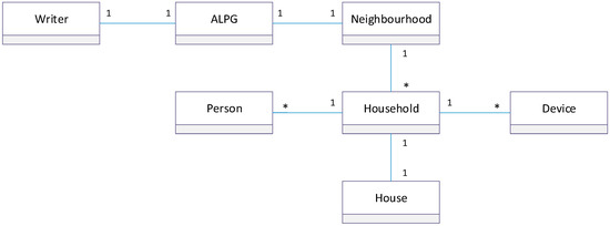 ALPG’s class diagram [17] that shows the cardinality of a class in relation to another. The example of one-to-one (1..1) relationship is depicted between Household and House, where a household lives in a house and a house belongs to a household. The one-to-many(1..*) relationship is shown between Household and Device, where a household has one or more devices, and each device belongs to a household. Each class from these multiple classes represents a part of the model, which makes the software flexible to be extended in the future work.