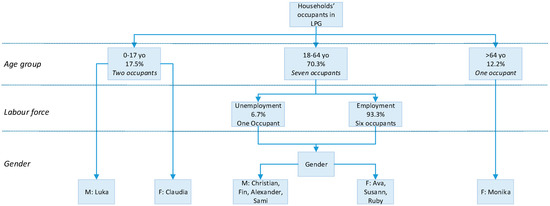 As a result, the age group 18–64 should consist of seven adult occupants with six of them working people and one person not working. Considering the gender share is quite balance in this age group, then it is either four females and three males, or four males and three females in the occupants’ list. Lastly, for the aged over 64, which has only one allocation, based on the results of the capacity and fairness of allocation model, we apply rounding value to the one which has the highest share to represent the senior age group. Therefore, we selected a female senior to represent this age group.