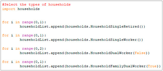 To fulfill the Wepro model and simplify the process, we selected: one single worker, one single retired, two dual worker and one family dual worker. ALPG is open-source code and the code is available at it’s github page. Figure 7 shows the snipped code of the households profiles selection, where the ALPG program runs by executing profilegenerator.py.:
