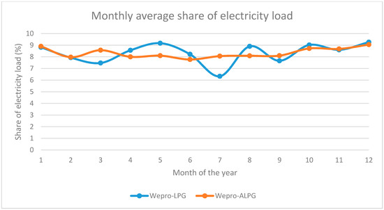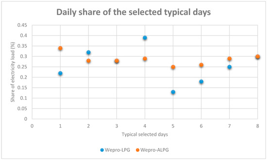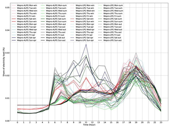 The hourly average share based on the days in each season show that the weekend days indicate a higher daylight share than the weekdays’ daylight share in both models. The result of the daily share of the selected typical days for all models indicates that most weekend days have a higher consumption share than weekdays in the same season. It concurs with an analysis of weekday and weekend variation, where weekend days show slightly more electricity use than weekdays [64]. Exception found in the Wepro-ALPG model’s selected days in winter, where weekday consumption is higher than at weekend.