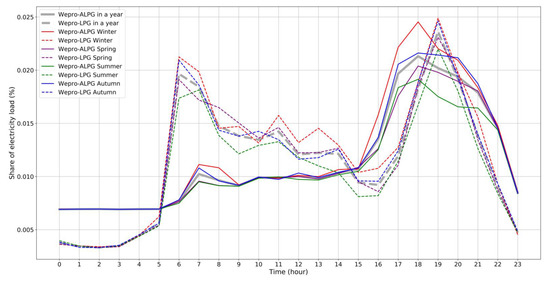 The hourly average load profiles in a year are provided in Figure 13 based on the expression in Equation (8). Figure 13 also illustrates the seasonal hourly average load profiles, where the load profiles for Wepro-LPG are shown in dashed lines and the load profiles for Wepro-ALPG are shown in solid lines. The Winter load profiles are shown in red, the Spring load profiles are shown in purple, the Summer load profiles are shown in green and the Autumn load profiles are shown in blue, where the hourly average load profiles in a year are shown in grey bold lines.