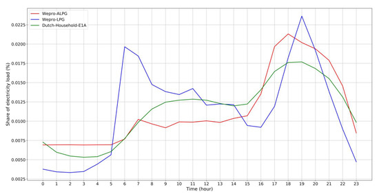 As an update, the load profile data in EDSN have been moved to de Vereniging Nederlandse Energie Data Uitwisseling’s (NEDU) page [33]. The data provided in NEDU’s page start from year 2016, therefore data 2016 are used in this initial validation. Smart-meter data is used as a basis for the consumption/production profiles as described in ‘Profielenmethodiek elektriciteit’, where the documentation is available in Dutch. The raw data are provided in 15 min resolution, which show how much electricity is allocated in that 15 min. The data are obtained from 3,002,450 households type E1A in 2016. The comparison of the standard average Dutch household load profile in 2016, which has similar trends with Figure 1 of [11] for E1A residential type and the hourly average load profile in a year of Wepro-LPG and Wepro-ALPG is plotted in Figure 14.