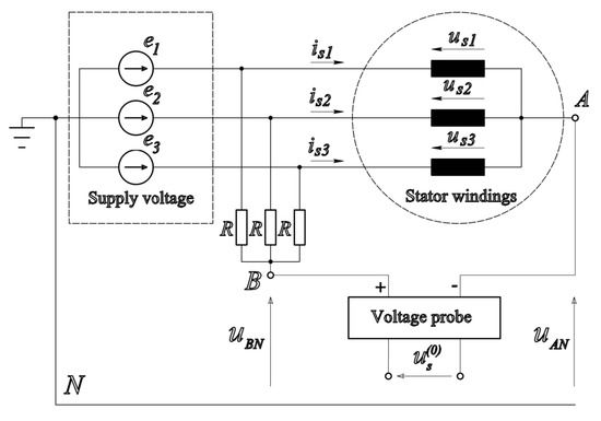 where is the stator winding resistance matrix, is the stator current vector, is the stator flux linkage vector, and is the mutual stator-rotor flux linkage vector. The method for ZSV measurement is shown in Figure 2 [13,18].
