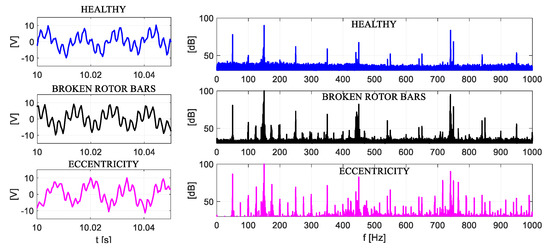 During the initial measurements, it was noticed that motor fault occurrence and supply voltage asymmetry have a strong impact on the ZSV waveform. Figure 3 shows the FFT of the analyzed cases: (a) Symmetry, (b) broken bars, and (c) eccentricity proved that the frequency spectra contained harmonics, which can be identified by means of known MCSA patterns.