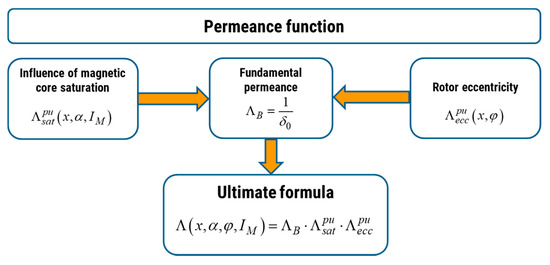 Considering the functions for modeling magnetic circuit saturation (8) and the eccentric position of the rotor (10), while neglecting the slotting of the stator and rotor, one can approximate the permeance of the motor with the formula obtained from amplitude modulation: