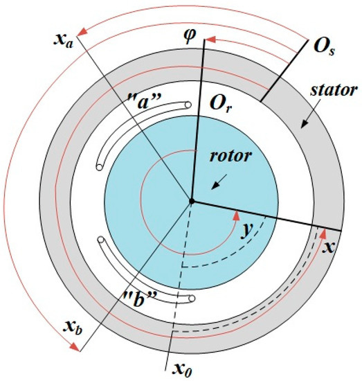 Each of the stator windings “a” and “b” (Figure 6) of the pole pair number equal to p wound symmetrically on the stator generates an electromotive force, which can be approximated by a Fourier series of harmonic orders for winding “a” and for winding “b” (15), belonging to the same set , .