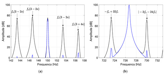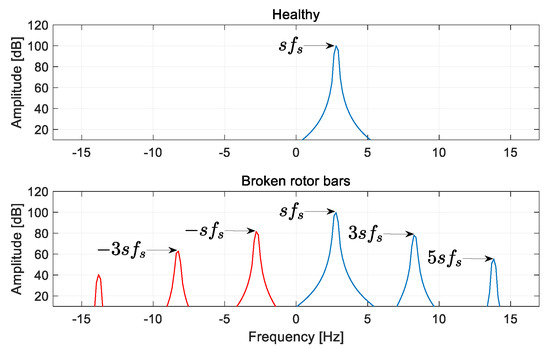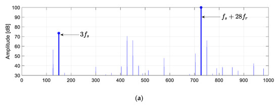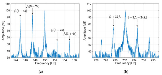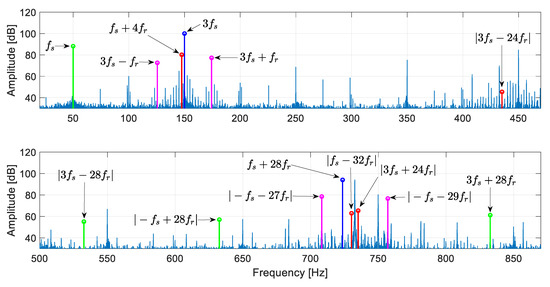 In the case of rotor cage asymmetry caused by bar damage, for example, additional harmonics whose frequencies are defined by or , where , appear in the p-th and (N-p)-th symmetrical component of the current. An example of such a spectrum obtained from simulation of the circuit model of the machine in MATLAB is shown in Figure 7, where one can observe new harmonics emerging due to rotor cage damage. Due to this phenomena, Formula (29) was transformed to the form shown below:
