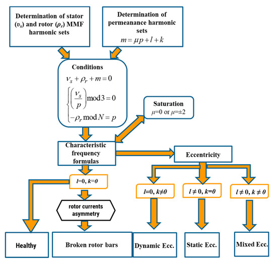 Although the formulas for specific frequencies (Table 2) are the same (excluding rotor cage asymmetry), the calculated frequencies vary among each other since takes different values depending on the type of asymmetry. Gathering all previous assumptions and formulas, the process of characteristic frequencies calculation can be algorithmized knowing only the pole pair number p and rotor cage bars number N. The algorithm is presented in Figure 8.