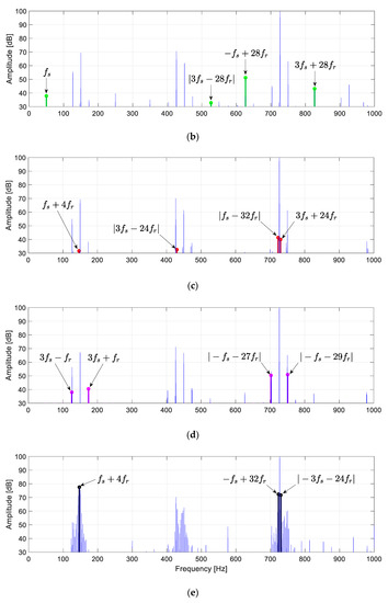 The obtained voltage waveforms were subjected to FFT analysis. Based on formulas for characteristic frequencies contained in Table 2, harmonics indicating specific fault types were highlighted (Figure 15).