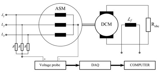 Measurement system where ASM is the cage induction motor, DCM is the separately excited DC generator, is the resistor, is the field winding, R is the resistor 100 kΩ, and DAQ is the measuring card.