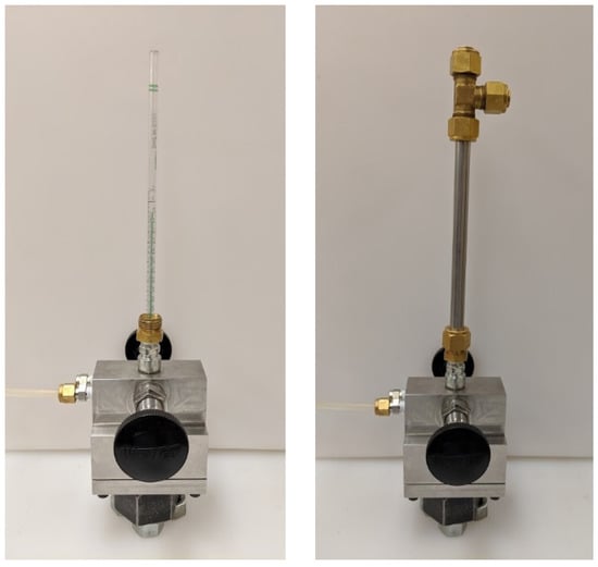 The chip-based sensors used to measure the change in chamber pressure that resulted from the spark discharge were intended, by the manufacturer, to measure small differential pressures relative to the ambient barometric pressure. Since the intention was to make measurements at high pressure, the sensors needed to be tested for their response at high pressure. To do this, a calibration procedure was developed that tested the pressure sensors in situ. The calibration device is depicted in Figure 3. A glass pipette was inserted through the spark plug hole and coupled to the passage tube of the pressure sensor with a short piece of plastic tubing. The pipette was then filled with water to a water column height that gave the desired pressure differential, the pipette thus acting as a manometer. A closed-end stainless steel tube was then fit over the pipette and secured with tube fittings. The two chambers of the calorimeter were when charged with nitrogen to the same gas pressure; the difference in pressure between the two chambers at the pressure sensor was the pressure imposed by the vertical column of water. This method allowed the pressure sensors to be calibrated for different high initial pressures and provided pressure measurements relative to the initial pressure.