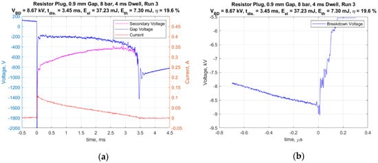 A standard representative 14 mm automotive spark plug (Champion RS12YC) was used for all of the tests. The center electrode (cathode) had a diameter of 2.5 mm and the width of the J-type ground strap was also 2.5 mm. It had a nominal internal resistance of 6.1 kohms. The inductive-type ignition coil had a secondary inductance value of 30 H. The default dwell time used was 4 ms. However, the effect of dwell times of 2 and 6 ms were studied as well. Figure 5a presents an example of the measured current delivered to the spark plug and a voltage trace corrected for the voltage drop across the internal resistor, and thus, represents the gap voltage. The integrated product of the corrected gap voltage and the current was used to calculate the electrical energy delivered to the gap. These representative traces were for conditions of 8 bar absolute gas pressure, with a 0.9 mm gap and a dwell time of 4 ms. Figure 5b shows a typical voltage trace having a short time scale as used to measure the breakdown voltage. The breakdown voltage for this trial was 8.67 kV and the spark duration was 3.45 ms.