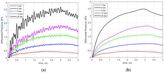 Figure 6a shows an example of recorded pressure traces for different initial gas pressures ranging from 1 to 24 bar. In general, the pressure rise was very rapid during the early part of the discharge, consistent with the high current levels during that period and representative of the large energy deposition during the breakdown process and shortly thereafter.
