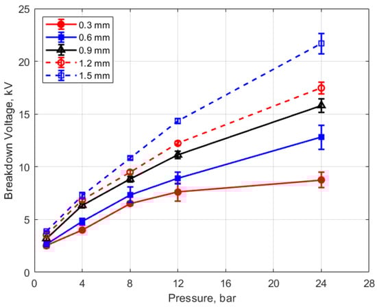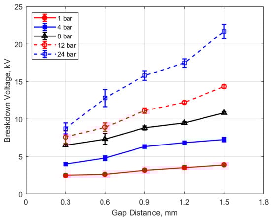Spark breakdown voltages were measured as well. They were in the expected range, based on the literature, but they did not closely follow the expected linear trends relative to changes in gas density and gap distance suggested by Paschen’s law (e.g., Figure 7 and Figure 8), with the rate of increase in breakdown voltages with increasing gap and increasing pressure less than linear.
