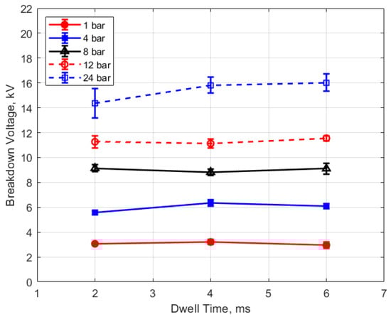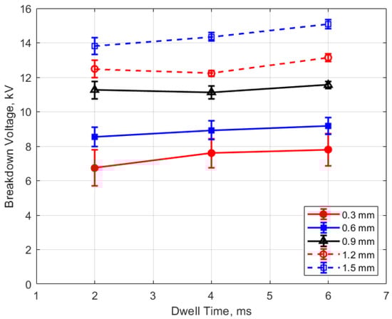 As expected, the breakdown voltage increases with both the gas pressure and the gap distance, but it is interesting to note that the breakdown voltage was not directly proportional to either of these variables even though linear relationships are predicted by Paschen’s law [5]. In the case of gas pressure, the breakdown voltage increased at a rate that diminished as the gas pressure increased. While the trend was closer to a linear increase for a changing spark gap, there was a considerable zero offset for the breakdown voltage at all of the pressures for the data extrapolated back to zero gap. In Figure 9 and Figure 10, the of effect dwell time on breakdown voltage is shown. There was no appreciable effect of either gap distance or gas pressure on the breakdown voltage within the uncertainty of the measurements over the dwell times ranging from 2 to 6 ms; however, a very slight increase in breakdown voltage with increasing dwell time is suggested from Figure 9. Since a longer dwell time results in more energy stored in the secondary coil and since the energy stored in an inductor follows Equation (3),