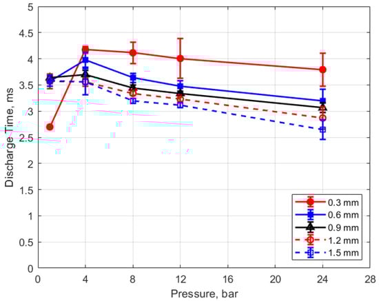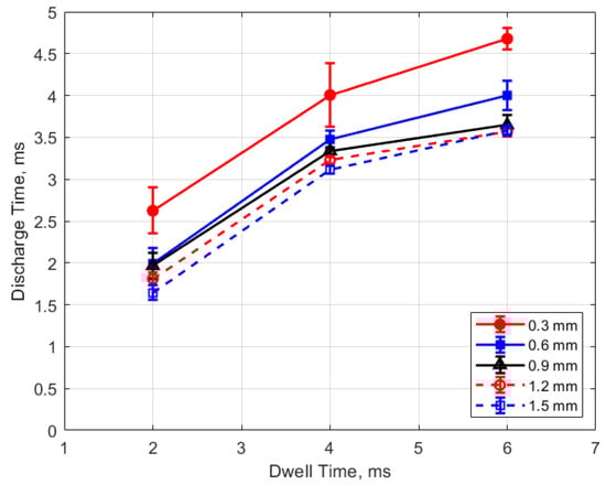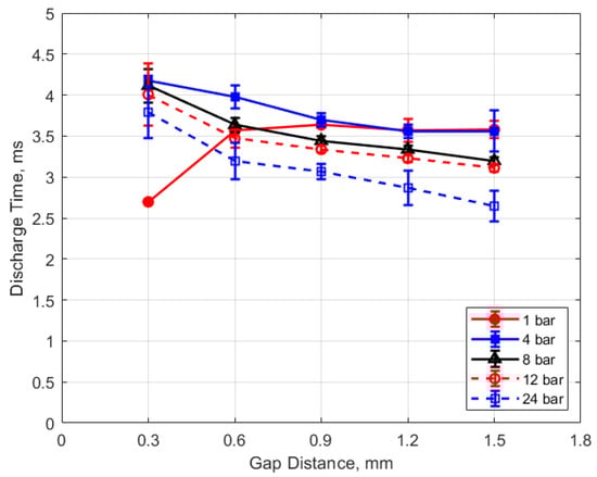 The discharge time or spark duration as a function of gas pressure, gap distance, and dwell time is given in Figure 11, Figure 12, Figure 13 and Figure 14. As seen in Figure 11, the spark duration is a weak function of gas pressure, but generally decreases with increasing pressure. The exceptions to this were the measurements at 1 atm, which show a shorter spark duration. This was associated with the glow-type discharge that was mentioned previously. The discharge times were in the range of approximately 3–4 ms. Figure 12 shows that the discharge times tended to shorten slightly as the gap distance increased; however, there is an exception for the 1 atm measurements. Figure 13 and Figure 14 show that spark duration increased with dwell time as more electrical energy was delivered to the gap, with the increase weaker from 4 to 6 ms than from 2 to 4 ms.