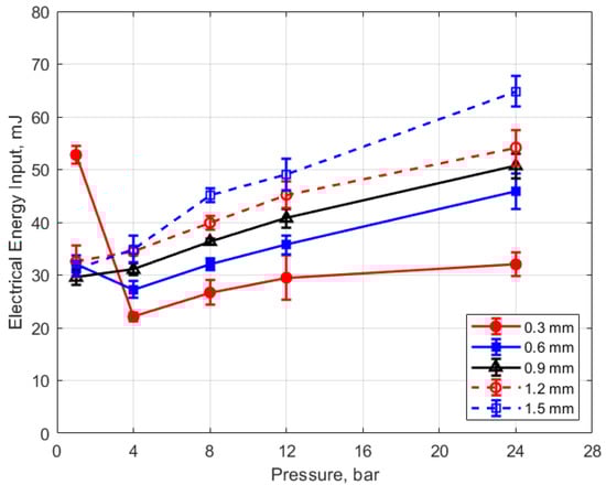 Electrical energy input vs. pressure for different gaps, for a dwell time of 4 ms.
